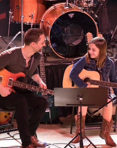 From starting with 2-finger chords that make chord changes doable to progressing to 3-finger chords, easily playing favorite songs to sing along to, and learning jazz theory, it's been a fun ride. I look forward to every class, and thanks to AJ, playing the guitar has become one of the most enjoyable parts of my week."